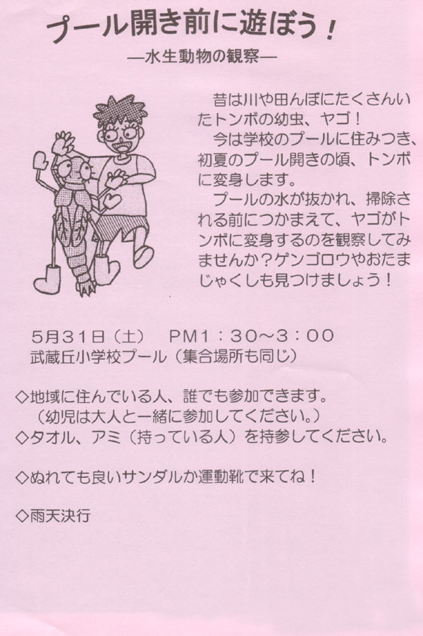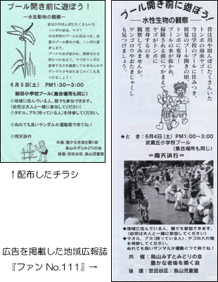 4月はじめ 学校へ協力依頼 区教委区委員会へあいさつ 5月はじめ 学校と日程決定 (プール開きの日を元に逆算して決める) 区教委区委員会へ日程お知らせ (→清掃業者) 消防署へ水抜き日を連絡 チラシ作成・配布 地域誌に掲載 保険加入(これは随意) 前日 プールの水抜き 当日 準備・開催・かたづけ
