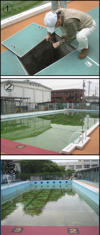 当日か前日、まず最初に行うべき準備は、事前に学校の協力を得て、プール清掃前の水抜き作業に合わせ、 水位の調整を行うことです。