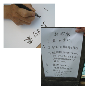 『横幕』貼り 『お約束』貼り パネル展示(ヤゴ・水草,他) 機材設営(手網・水草・エサ 飼育マニュアル・顕微鏡など ※あれば用意すると良い